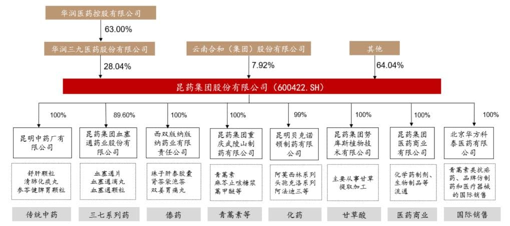 昆药集团肇启于明代,至今已有600多年的历史,为我国五大中药老号之一,改制后于2000年上市。依托云南丰富的植物资源,先后开发了青蒿、三七、天麻三大系列特色药,现有药品批准文号143个,独家产品21个,涵盖参苓健脾胃颗粒、舒肝颗粒、清肺化痰丸等多个独家或原研产品。