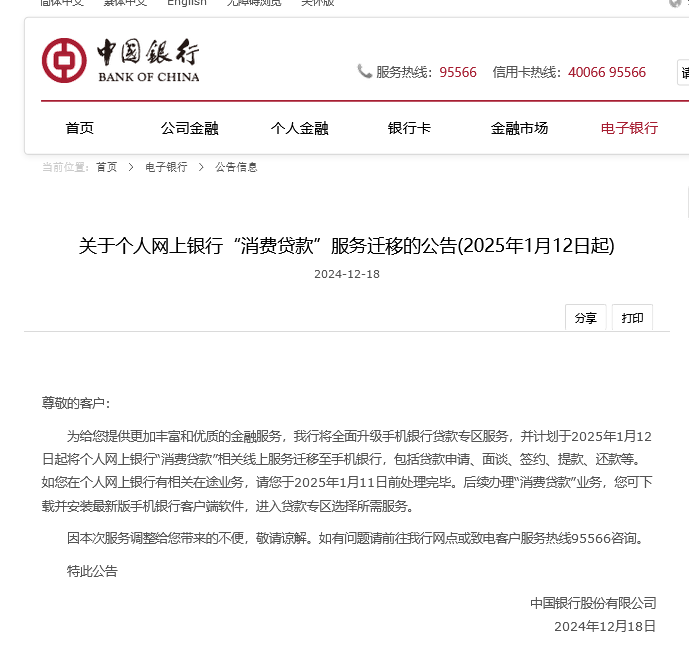 网上银行相关业务将下线!中国银行消费贷办理转移至手机银行