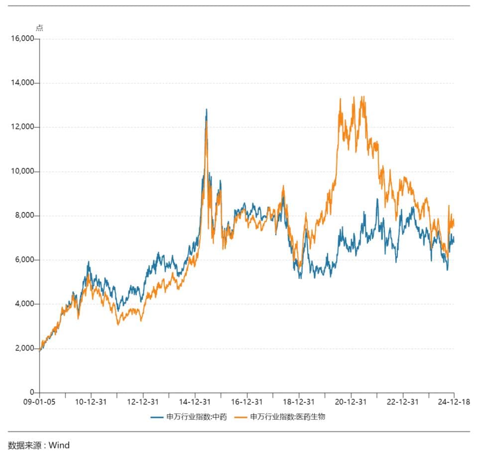 Wind数据显示,SW中药行业指数在2015年左右达到巅峰,随后一直处于相对低位,并在2019年后与SW医药生物行业指数的差距差距拉大,直至约2021年以后双方差距缩小。