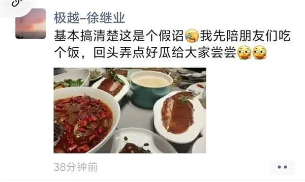 随后,徐继业再次通过朋友圈发声,表示“基本搞清楚这是个假诏”,同时还表示在陪朋友吃饭,回头弄点好瓜(爆一些猛料)。