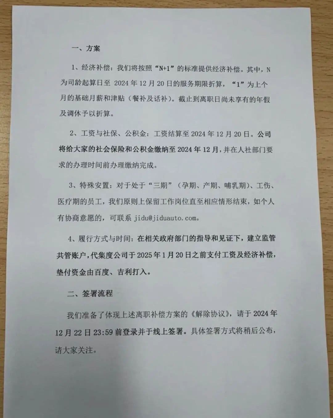 履行方式上,会在相关政府部门的指导和见证下,建立监管共管账户,代集度公司(即“极越”)于2025年1月20日之前支付工资及经济补偿,垫付资金由百度、吉利打入。
