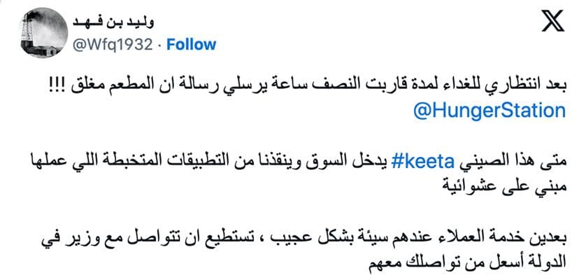 Keeta在沙特上线,有网友表达了希望其“整顿市场”的愿望:“在HungerStation上点单半小时后才告诉我餐厅已经关门了!中国的外卖平台Keeta能进入市场,拯救我们脱离这些混乱随机的应用程序!”