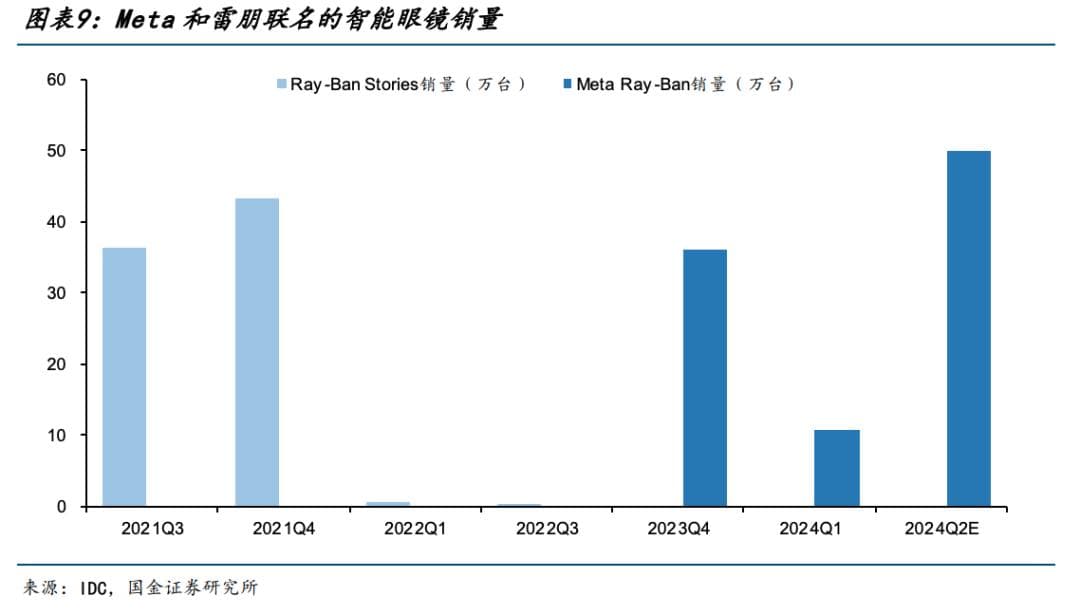 今年4月搭载AI功能后,Ray-Ban Meta的销量迎来了突破式增长。据IDC调研,2023年Q4及2024年Q1 ,Ray-Ban Meta出货量分别为36万台、10万台;据国金证券估算,2024年Q2 Meta Ray-Ban出货量或达50万台,年化销量有望达200万台。