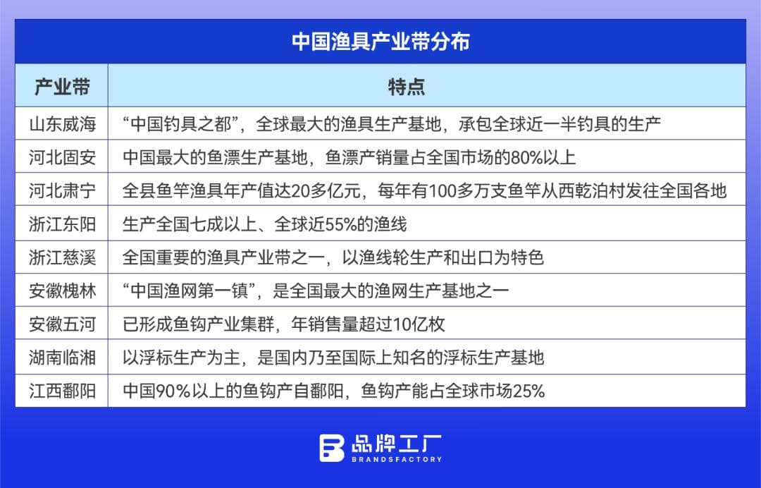 无论是精致的鱼竿、灵敏的浮标,还是多彩的鱼线、锋利的鱼钩,都能在中国找到专业的产业带进行生产,如山东的钓竿、湖北的鱼饵、宁波的鱼轮、江西的鱼钩。