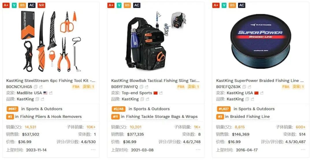 这种价格优势,使得KastKing在2023年的销售额突破了5亿元人民币大关,并且成为了亚马逊美国站渔具品牌销量第一。卖家精灵数据显示,在亚马逊北美站,KastKing旗下产品已售出300万单,售价36.99美元一套的钓鱼工具包已经卖了14000多份。
