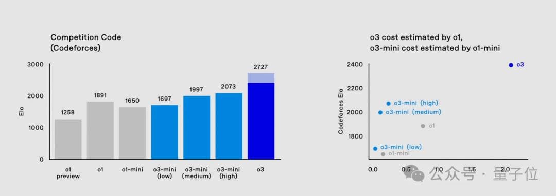 因为o3支持低思考程度和高思考程度两种设置,高思考程度花费的算力(横轴)也直接拉满。