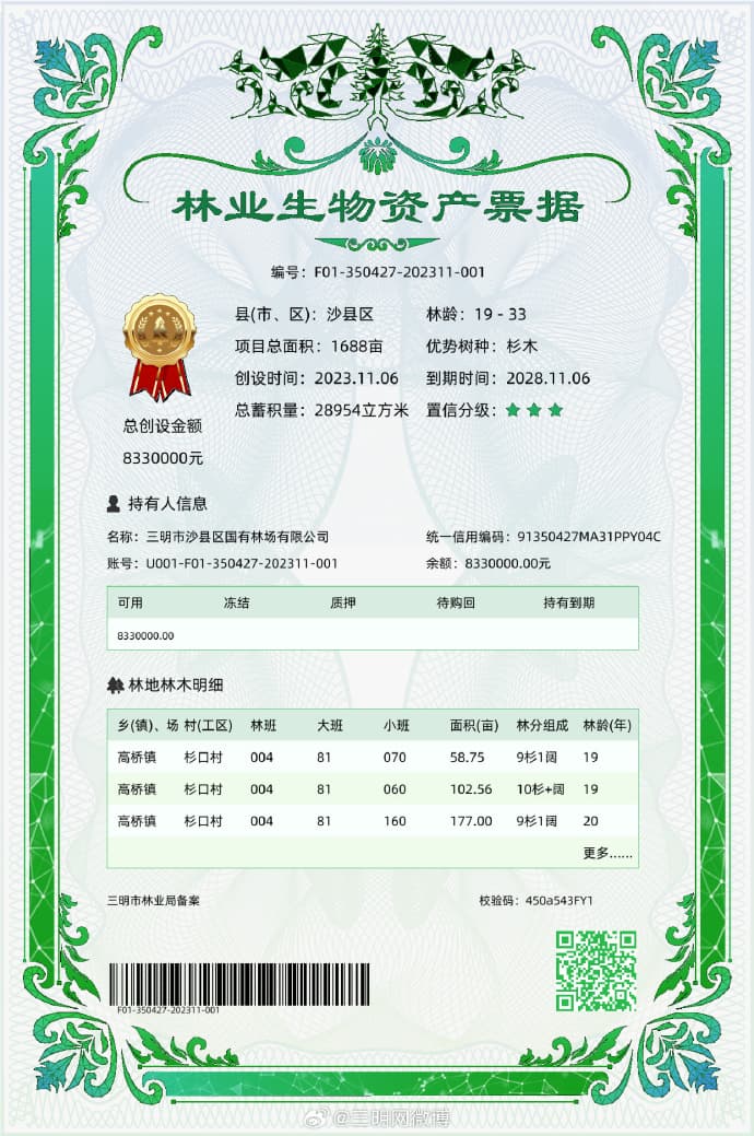 目前,三明兴业银行已将首张林票2.0认定为可接受押品,并对其授信800万元——当然,这只是林票2.0金融价值的初步释放。