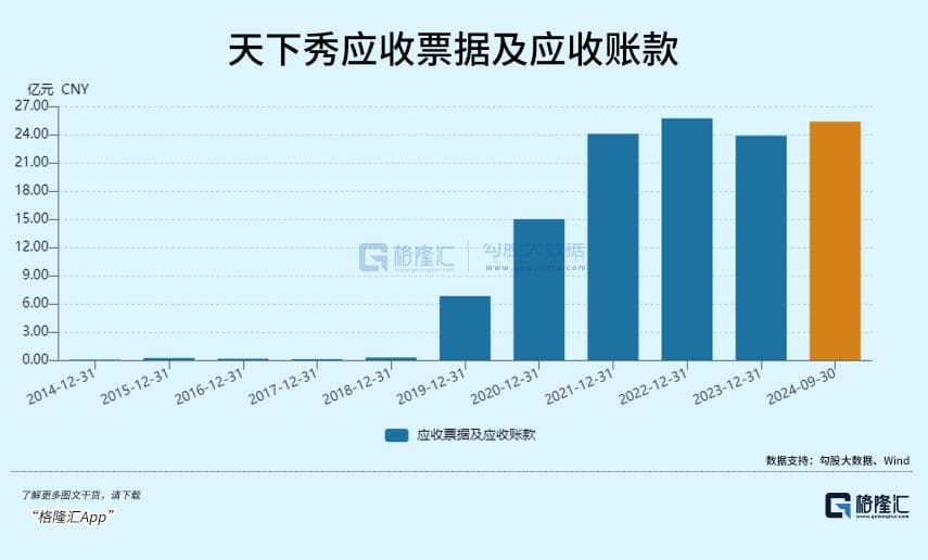 同样引人关注的是,天下秀的应收账款体量较大,近几年来,天下秀的应收账款余额均维持在较高水平,2022年末、2023年末,天下秀应收账款余额分别为26.68亿元、25.7亿元。到今年前三季度应收账款仍有25.3亿,并没有明显减少。