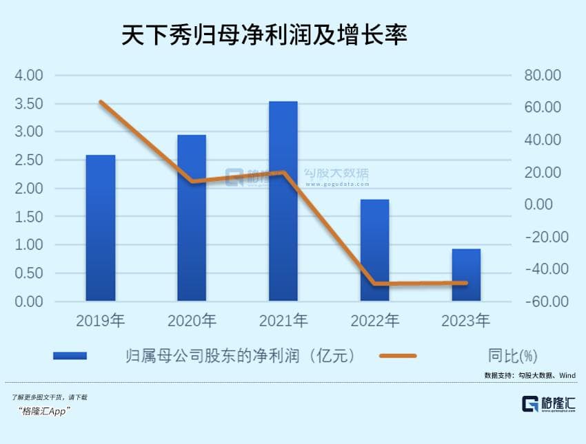然而此后,天下秀的业绩便开始急转直下。2022年、2023年,公司净利润断崖式下跌,分别同比减少了49.22%、48.43%。