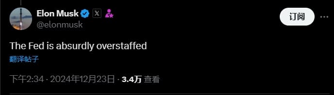 当地时间周一凌晨,马斯克在评论一条概述美联储明年政策路径的帖子时突然表示:美联储的人员配备明显过多,简直离谱。