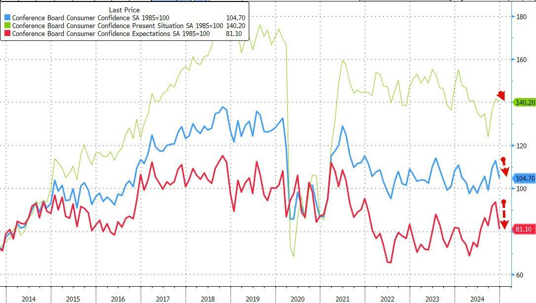 世界大型企业联合会周一公布的数据显示,美国12月消费者信心指数下降至104.7,远低于预期值113.2,前置为112.8。