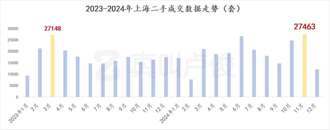 11月,上海二手最突出的是成交量,成交了27463套。这个数字直接登顶今年第一。也是去年3月开始近20个月的最高成交量。