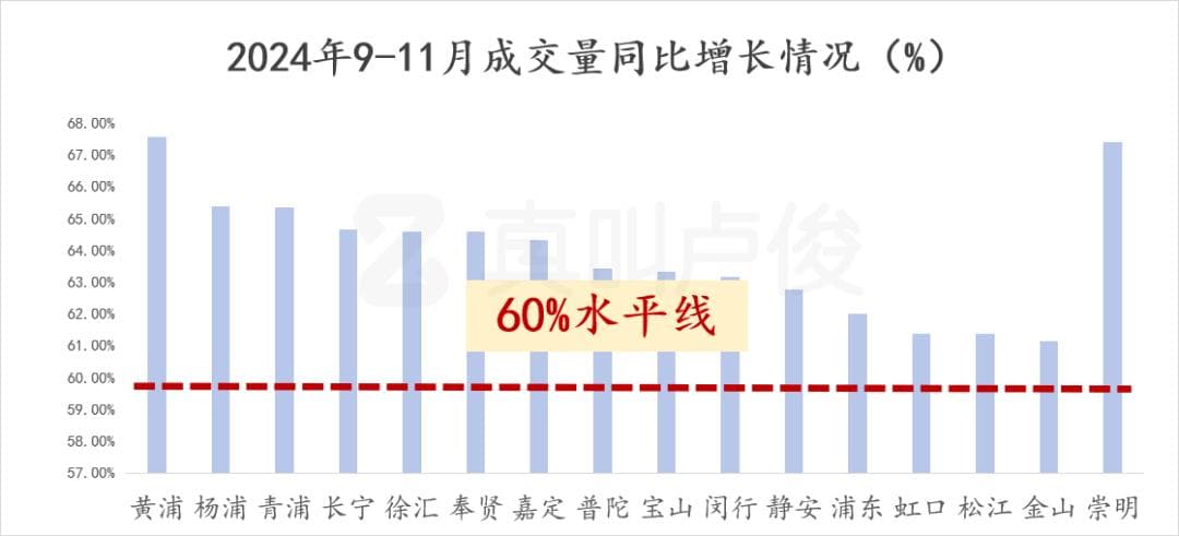 9月新政后,一直到11月,成交量对比去年,全市各区域同比增长都在60%以上。各位注意,是全市每个区都超过了60%。哪怕没什么存在感的崇明和金山,整个上海增长趋势出乎意料地一致。