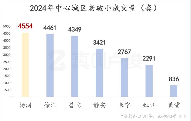 我筛选了中心城区内房龄超过20年、面积60平以下的房子,成交量破4000套的一共有三个区域。杨浦、徐汇、普陀,成为今年老破小最受欢迎的区域。尤其杨浦,鞍山、中原、黄兴一带的老破小扎堆聚集,本身就是内环老破小最集中的区域之一。加上周边不少新房挤压,价格一低再低。