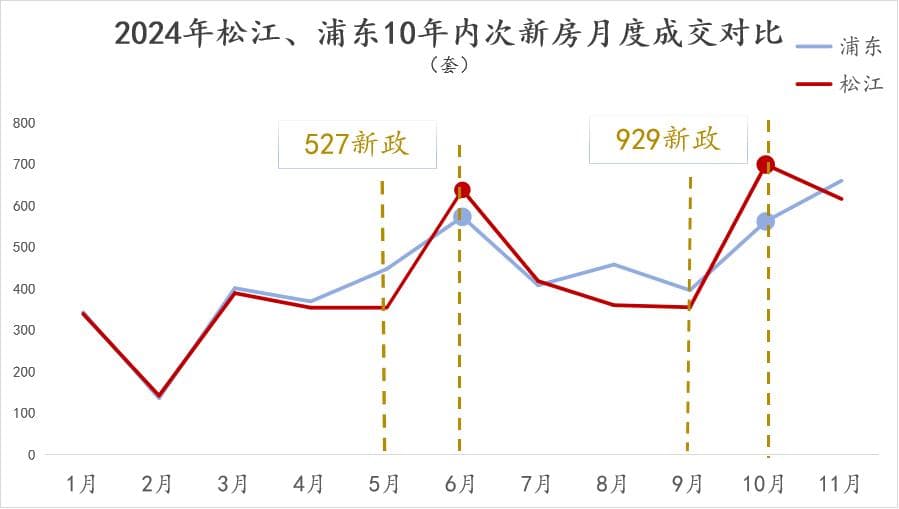 松江今年的次新成交基础本身就不低,借着两次新政又往上蹿了一蹿。而且和浦东的数据咬得很紧。