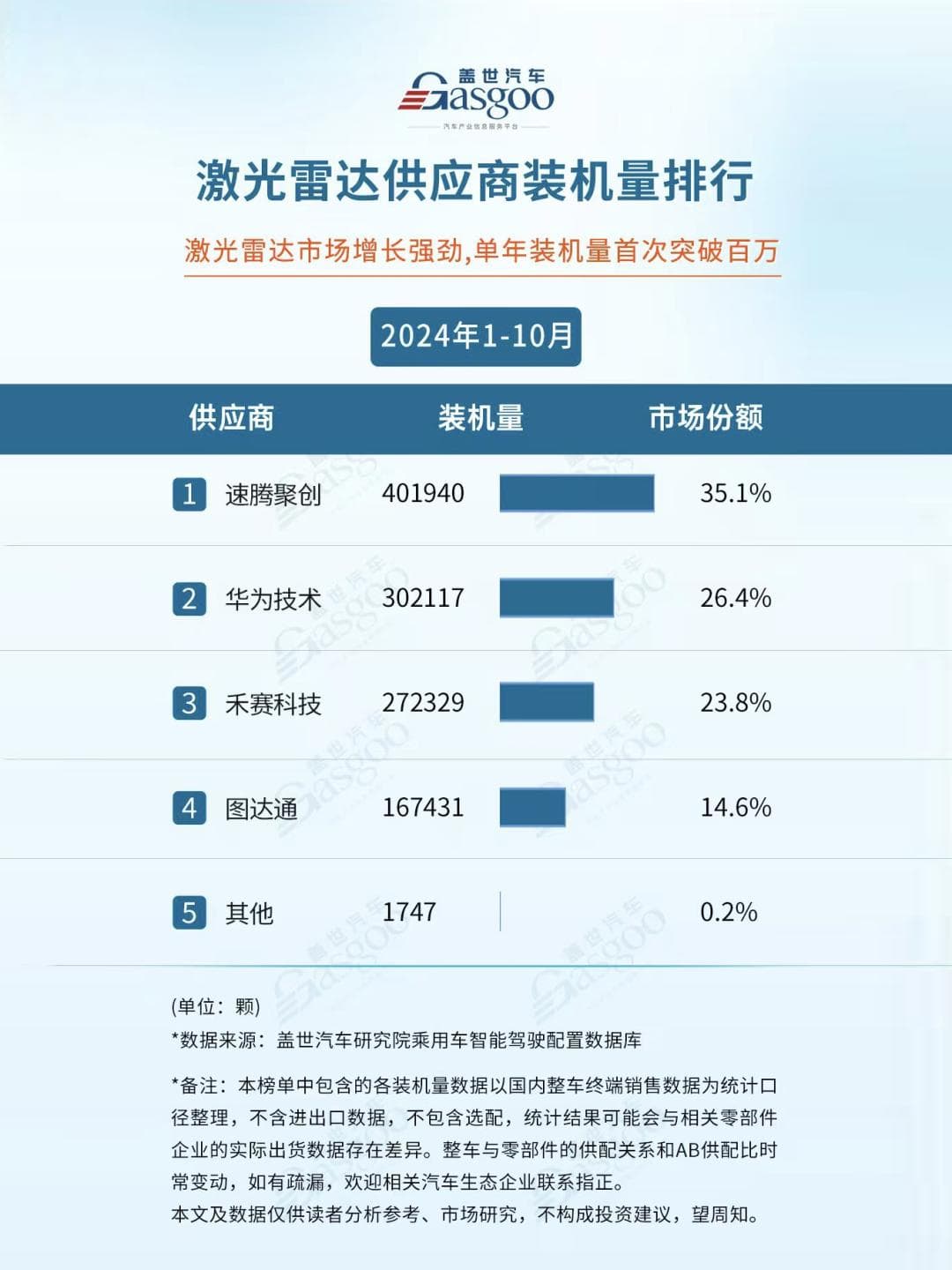 据高工智能汽车研究院的数据,今年1~9月,前装标配激光雷达上车量达到99.42万台,同比增长202.10%。9月单月搭载交付量首次超过15万台,达到15.62万台;10月继续增长,达到16.04万台。在售标配激光雷达车型数量达到76款,同比增长181.48%。