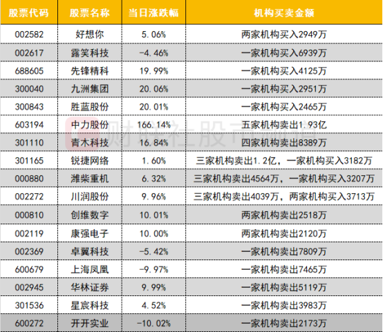 卖出方面,新股中力股份遭机构卖出1.93亿;CPO概念股锐捷网络遭机构卖出1.2亿,该股连续两日遭机构大幅卖出;微信小店概念股青木科技遭机构卖出超8000万;AI眼镜概念股卓翼科技遭机构卖出超7000万。