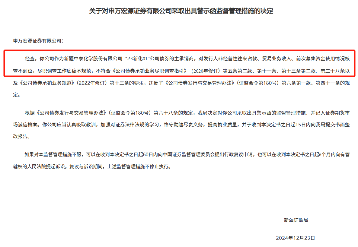 申万宏源证券作为中泰化学“23新化01”公司债券的主承销商,对发行人非经营性往来占款、贸易业务收入、前次募集资金使用情况核查不到位,尽职调查工作底稿不规范。