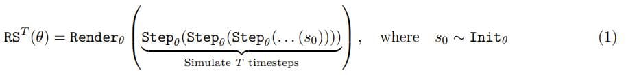 虽然通常而言,并不需要参数化和搜索渲染函数,但当状态值难以先验地解读时,就很有必要了。将这些项串到一起,可定义一个 θ 函数,它对初始状态 s_0 进行采样,运行 T 步模拟,并将最终状态渲染为图像: