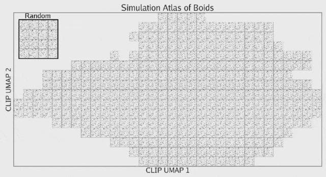 此可视化凸显了按视觉相似性组织的行为的多样性。使用 Lenia 时,ASAL 发现了许多前所未见的生命形式,这些生命形式类似于按颜色和形状组织的细胞和细菌。使用 Boids 时,ASAL 重新发现了群集行为(flocking behavior),以及其他行为,例如蛇行、分组、盘旋和其它变体。