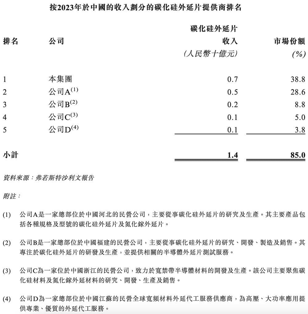 弗若斯特沙利文资料显示,天域半导体在2023年中国碳化硅外延片市场的份额,按收入计达到38.8%(收入约7亿元),按销量计达到38.6%,排名国内第一。