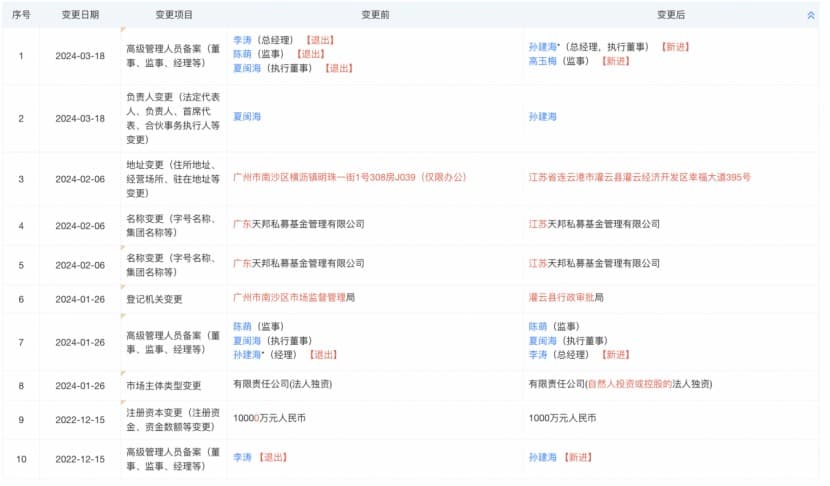 据天眼查,今年1月起,天邦基金高管频繁变动,工商名称也由广东天邦私募基金管理有限公司变更为江苏天邦私募基金管理有限公司。早在2022年,天邦基金的注册资本由原先的1亿元减资至1000万元。另外,自成立以来,天邦基金还参投了鱼子酱生产商卡露伽、兽药生产商史纪生物、供应链管理服务商拾分味道等。