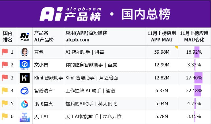 但靠着实打实的钞能力,豆包APP 11月份的月活已经达到近6千万,保持 10% 以上的增速。目前,在国内AI原生应用(APP)中,豆包早就是遥遥领先的第一名,排在其后面的是1299万月活的文小言,1282万月活的Kimi。(数据来源:AI产品榜)