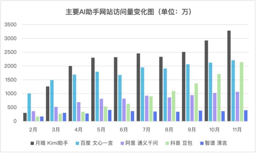 投流是典型的“大力出奇迹”式操作。AI产品榜数据显示,自今年2月到11月,Kimi网站访问量从最初的305万飙升到3282万;豆包则一路从173万增长到2143万。