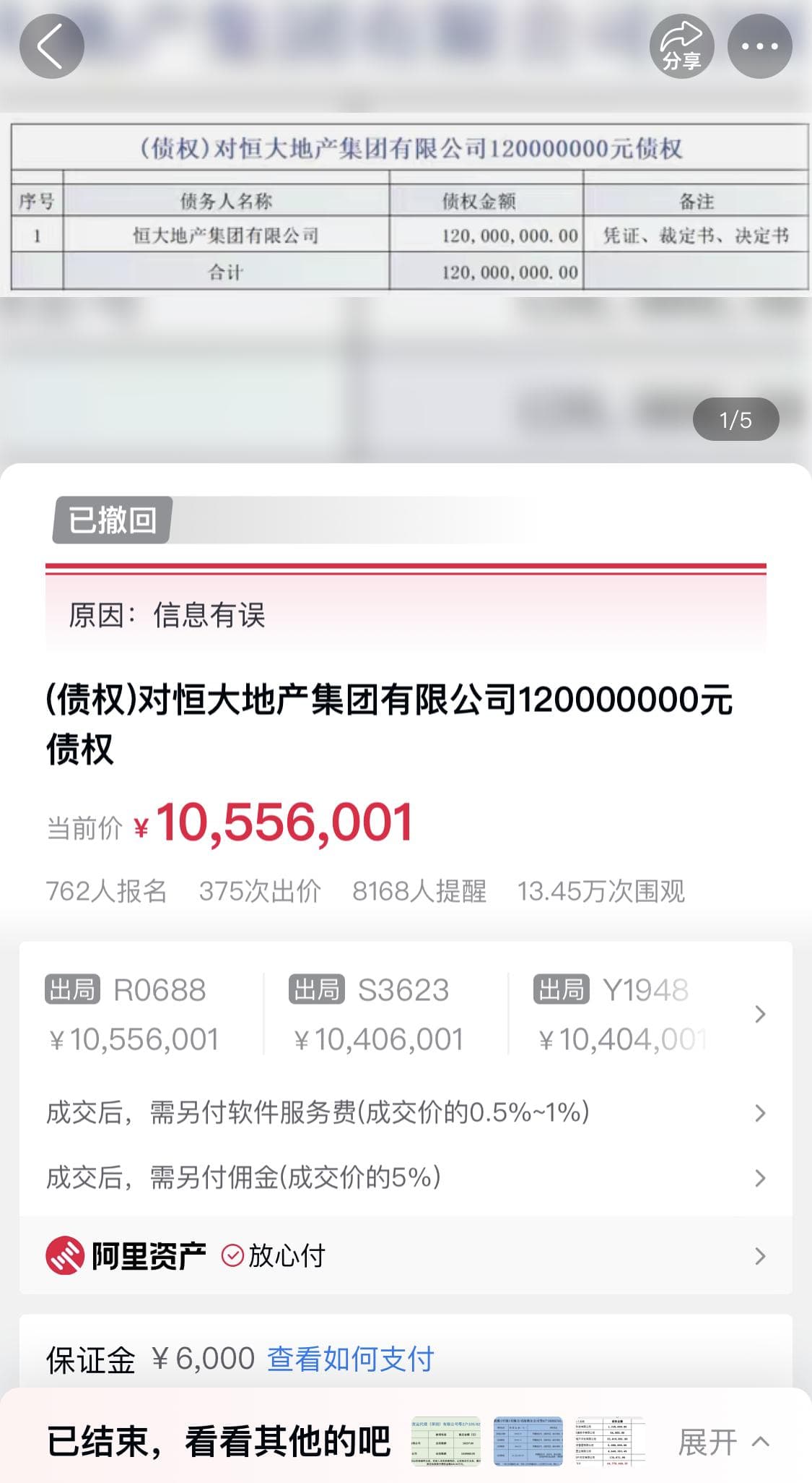 阿里资产信息显示,本次拍卖被撤回前,已有762人报名参加该标的本次拍卖,经375次出价,当前价显示为1055.6万元。该标的拍卖本次被撤回原因,显示为“信息有误”。