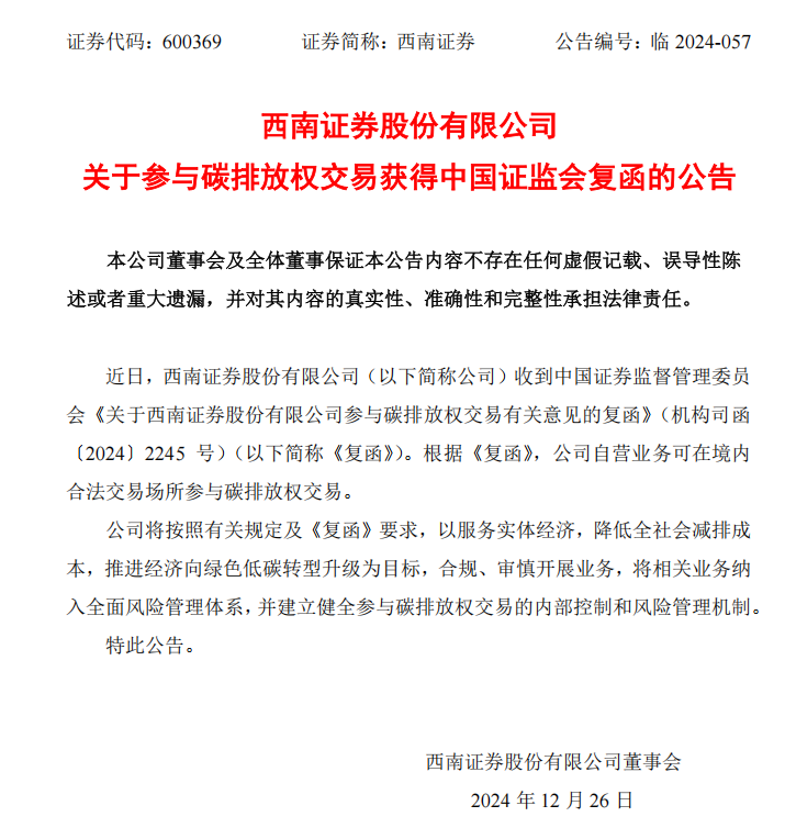 12月25日,西南证券发布公告,公司收到证监会复函,公司自营业务可在境内合法交易场所参与碳排放权交易。公司将按照有关规定及复函要求,以服务实体经济,降低全社会减排成本,推进经济向绿色低碳转型升级为目标,合规、审慎开展业务,将相关业务纳入全面风险管理体系,并建立健全参与碳排放权交易的内部控制和风险管理机制。