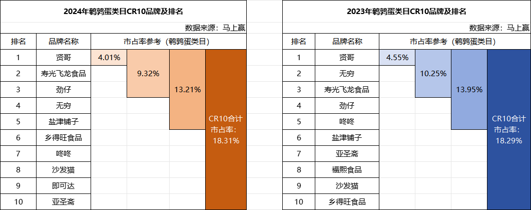 马上赢数据显示,今年,鹌鹑蛋零食CR10仅18.31%,同比2023年微增0.02个百分点。排名第一的贤哥,市占率从去年的4.55%缩窄至4.01%,排名第八位的沙发猫,其市占率不足1%,三只松鼠(300783.SZ)、百草味等众多知名零食品牌,未能挤进前十。
