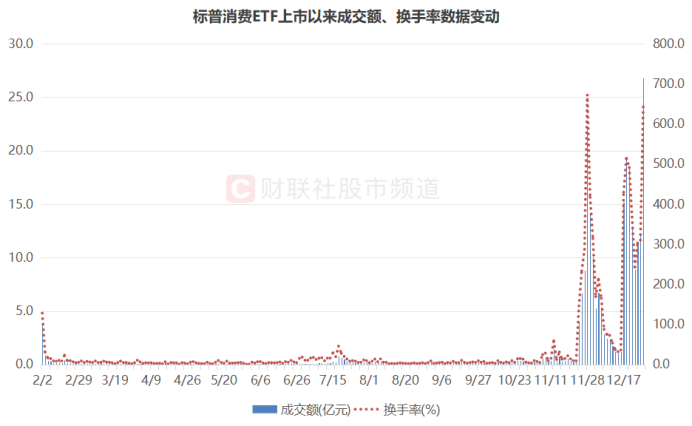 财联社12月26日讯(编辑 梓隆),今日(12月26日),ETF市场呈现高热状态,截至收盘,累计共有8只ETF换手率单日超100%。其中,年初上市的标普消费ETF高度活跃,全天换手率达647%,溢价率也至26.2%,其盘中一度溢价近30%。