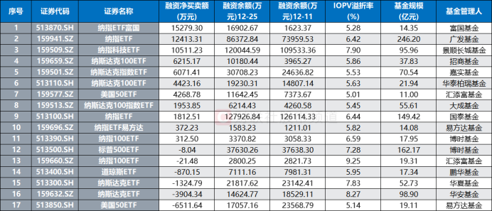 此外,多只高溢价ETF近期也获融资客大幅加仓。截至12月25日数据,筛选溢价率超5%的ETF基金,富国基金纳指ETF、广发基金纳指ETF、景顺长城基金纳指科技ETF近2周分别获融资净买入近1.5亿元、1.2亿元、1.1亿元。不过,也有部分高溢价ETF近期融资余额大幅下降,易方达基金美国50ETF、华安基金纳斯达克ETF等近2周融资净卖额居前。