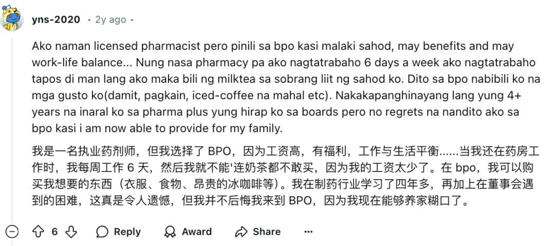 在行业发展的早期,BPO 甚至一度被菲律宾人视作尊贵的“金领”行业,优渥的薪酬吸引了医生、护士、工程师等纷纷转行,虽然如今的多数岗位待遇已逐渐回归均值,却依旧是不少菲律宾人争取更高收入的现实选择。