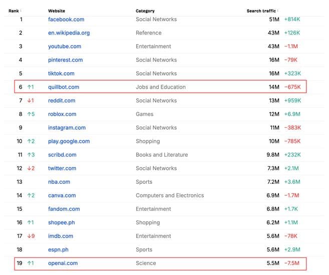 可能也是这种 AI 入侵工作岗位的迫切“威胁”,让更多菲律宾人认识到了 AI 具备可用性的一面,尤其是语言提升方面,在频繁地对外交流中 AI 能让菲律宾人更加如鱼得水。虽然菲律宾身上一直带着英语好的标签,但是英语始终作为第二语言,交付对象如果是英语母语者,或者是学术、公文写作等严肃场合,细纠语法和措辞就不是那么够用。于是我们看到 Quillbot 这样的 AI 写作助手能超车 ChatGPT 在菲律宾自然搜索量能排到 Top6,给个人生产力工具的产品指明了一个目标市场。