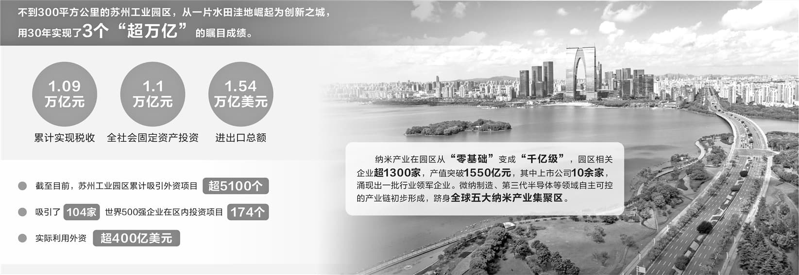 数据能够带来最直观的感受。不到300平方公里的苏州工业园区,用30年实现了3个“超万亿”的瞩目成绩——累计实现税收1.09万亿元、全社会固定资产投资1.1万亿元、进出口总额1.54万亿美元。从一片水田洼地崛起为创新之城,从学习借鉴先进经验到自身经验复刻推广,30年间,苏州工业园区是如何做到的?