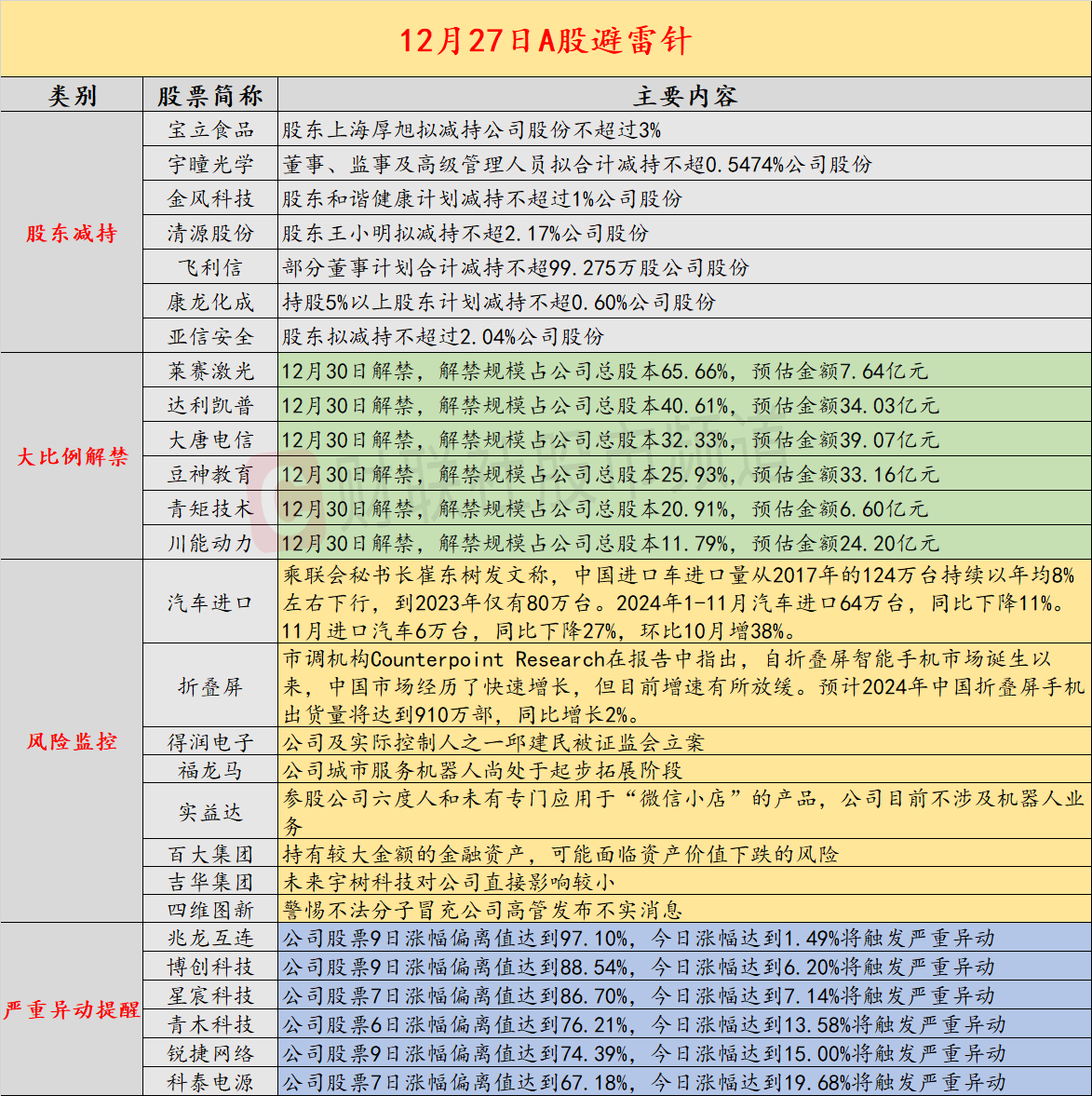 导读:财联社12月27日投资避雷针,近日,A股及海外市场潜在风险事件如下。国内经济信息方面包括:1)2024年1-11月汽车进口64万台,同比下降11%;2)机构报告指出,中国折叠屏智能手机市场增速放缓;公司方面重点关注包括:1)6天3板得润电子公司及实际控制人之一邱建民被证监会立案;2)3连板福龙马提示风险,公司城市服务机器人尚处于起步拓展阶段;海外市场重点关注包括:1)美股三大指数收盘涨跌不一,大型科技股多数下跌;2)海外多家投行预测2025年铁矿石价格或将继续下行。