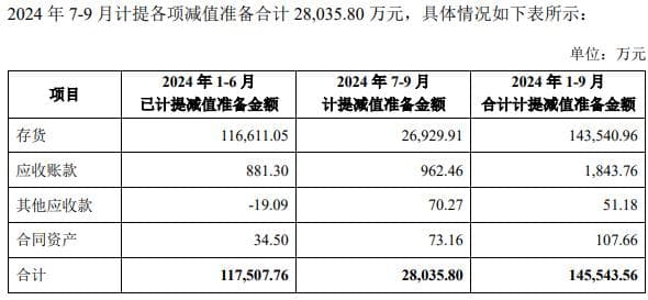 除了有息负债上涨外,爱旭股份的存货也有明显的增长。到2024年第三季度,爱旭股份的存货已高达35.98亿元,较2023年同期增长了4.63亿元。据爱旭股份披露,2024年1-9月,公司对存货已计提了14.35亿元的跌价准备。