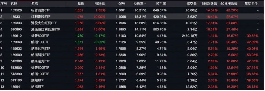 具体来看,标普消费ETF溢价最高,达26.21%,红利港股ETF、港股央企红利ETF、港股通红利低波ETF以及标普500ETF溢价率均超过10%;换手率方面,标普消费ETF换手率以646.67%居首,港股央企红利ETF换手率同样超过610%,港股通红利低波ETF换手率超5倍、港股红利低波、红利港股ETF换手率超4倍,中韩半导体ETF换手率也超过1倍。