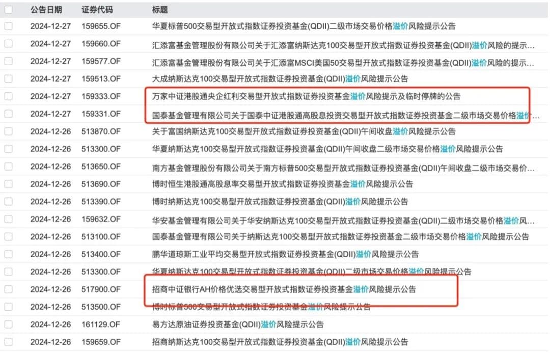 因此,基金公司会在ETF出现高溢价时提示风险。24日以来,跨境ETF、港股ETF公布溢价风险提示的公告多达70条。