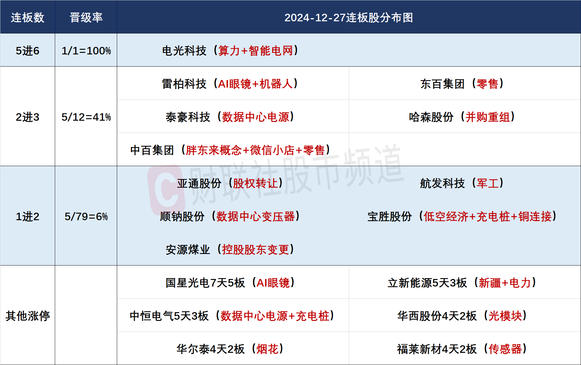 财联社12月27日讯,今日66股涨停,35股炸板,封板率为65%,电光科技6连板,中百集团20天12板,东百集团、泰豪科技、雷柏科技、哈森股份3连板,国星光电7天5板,宝胜股份7天4板,立新能源、中恒电气5天3板。沪深两市全天成交额1.43万亿,较上个交易日放量1614亿。盘面上,热点快速轮动较为杂乱,个股涨多跌少,全市场超3500只个股上涨。板块方面,农业、海南、军工装备、电网设备等板块涨幅居前,电商、半导体、铜缆高速连接、CPO等板块跌幅居前。截至收盘,沪指涨0.06%,深成指跌0.13%,创业板指跌0.22%。