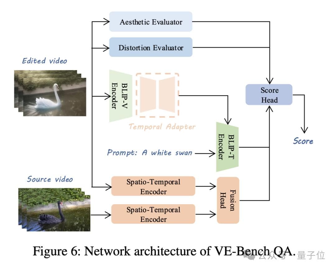 为了衡量所编辑视频是否与文本有关,VE-Bench QA基于BLIP进行了有效的视频-文本相关性建模,通过在BLIP视觉分支的基础上加入Temporal Adapter将其扩展到三维,并与文本分支的结果通过交叉注意力得到输出。