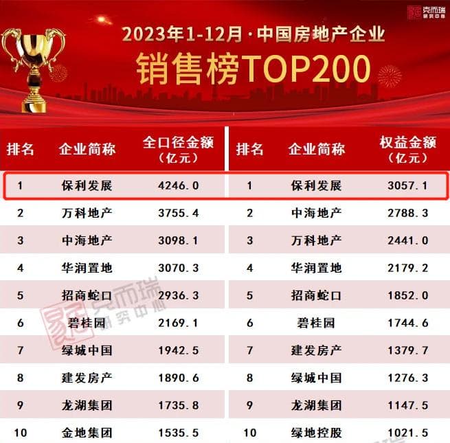 在2021年克而瑞的销售榜单上,保利发展的全口径销售金额以及权益销售金额都是第4名的位置,而到了2023年,保利发展全口径和权益销售金额已经成为了TOP1,也是行业唯一一家销售额过4000亿的房企,成为了行业大哥大。