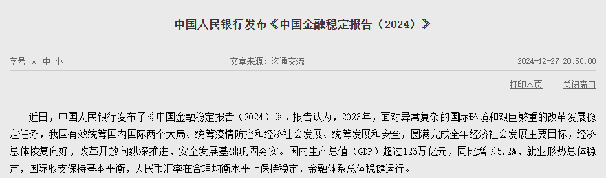 12月27日,中国人民银行(下称“央行”)发布《中国金融稳定报告(2024)》(下称“报告”),对中国金融体系的稳健性状况进行全面评估。