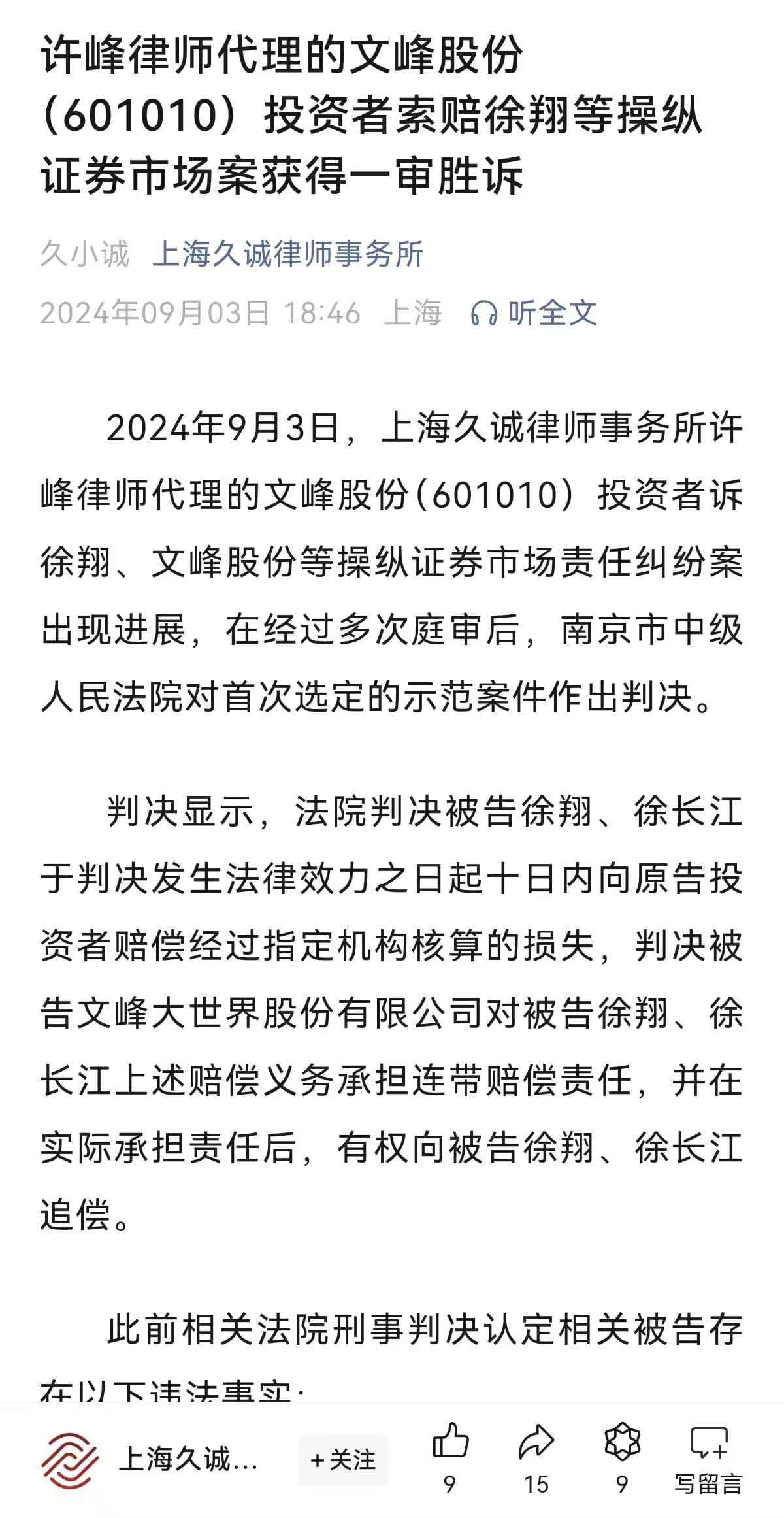 今年9月,徐翔被法院判决赔偿投资者上百万元损失。据“上海久诚律师事务所”公众号9月3日发布,该律所许峰律师代理的文峰股份投资者诉徐翔、文峰股份等操纵证券市场责任纠纷案一审获胜。
