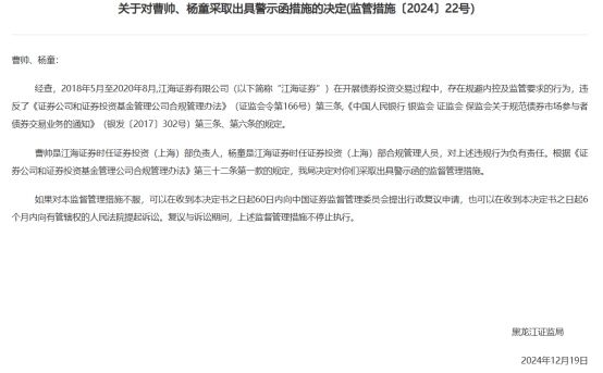 根据黑龙江证监局12月27日官网披露,江海证券及两名时任负责人被罚。核心违规事项主要是2018年5月至2020年8月,江海证券在开展债券投资交易过程中,存在规避内控及监管要求的行为,反映出公司内部控制不完善。其中,曹帅是江海证券时任证券投资(上海)部负责人,杨童是江海证券时任证券投资(上海)部合规管理人员,对上述违规行为负有责任。