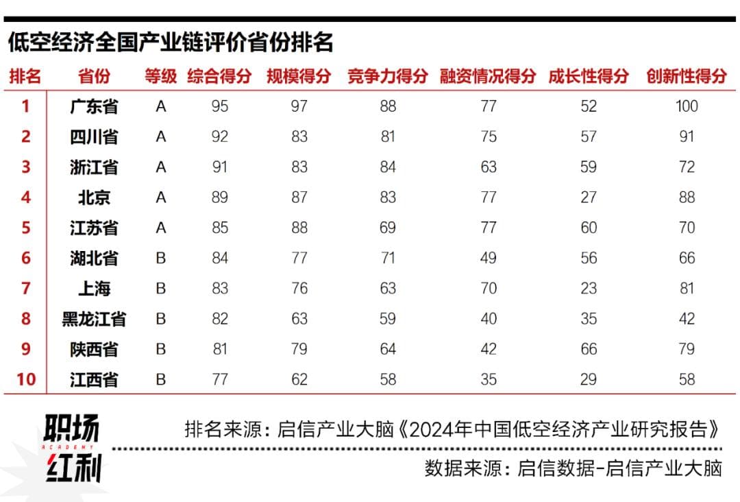 其中,广东省堪称低空经济人才的黄埔军校。据启信数据,在低空经济产业链上企业数量、评价排名方面,广东省均为第一名。