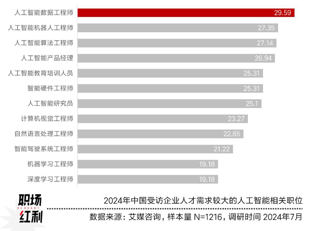 相对应地,企业开始大量招聘相关人才。艾媒咨询数据显示,2024年中国受访企业中,人工智能数据工程师(29.59%)、人工智能机器人工程师(27.35%)和人工智能算法工程师(27.14%)是需求最大的3个人工智能相关职位。