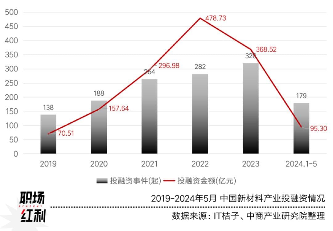 资本往往流入最有前景的行业。2024年1-5月,新材料产业的投资热度仍旧高涨,五个月内完成了179起投融资事件,超过2023年总量的50%,投融资金额达到95.30亿元人民币。
