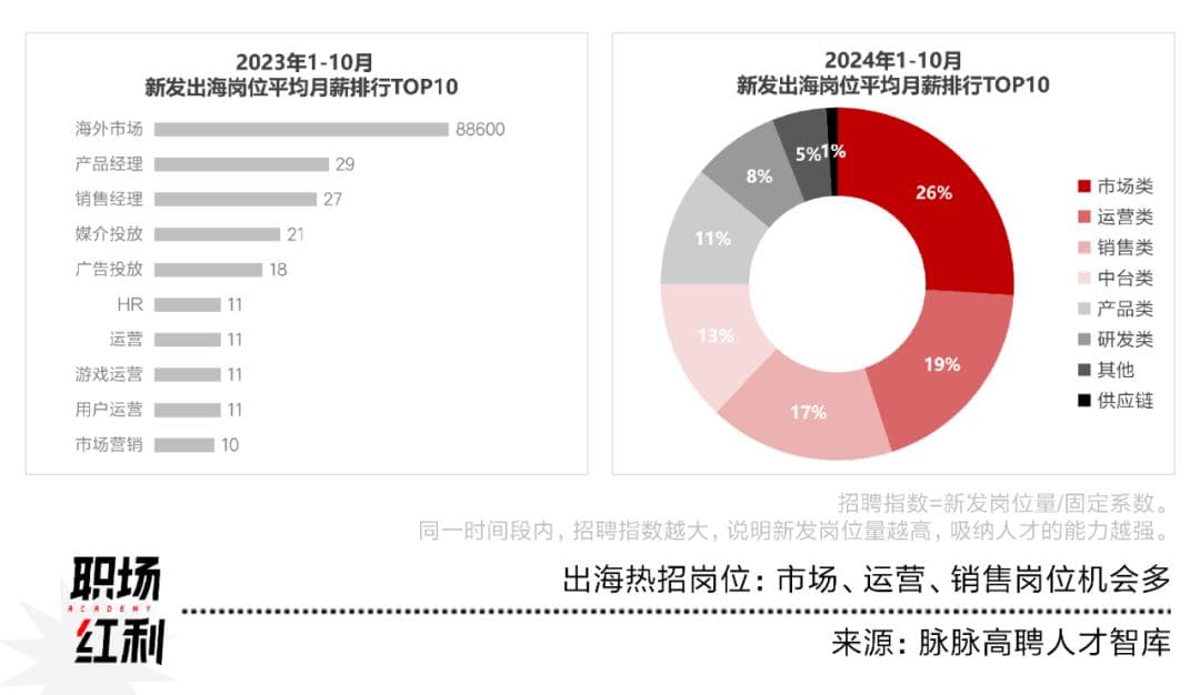 为适应社交电商的兴起,电商平台对市场、运营的需求增加。根据脉脉发布的《2024年度人才迁徙报告》显示,今年1-10月海外市场、产品经理、销售经理是新发的出海岗位中数量最多的。热招TOP10岗位也主要集中在市场、运营和销售方向。